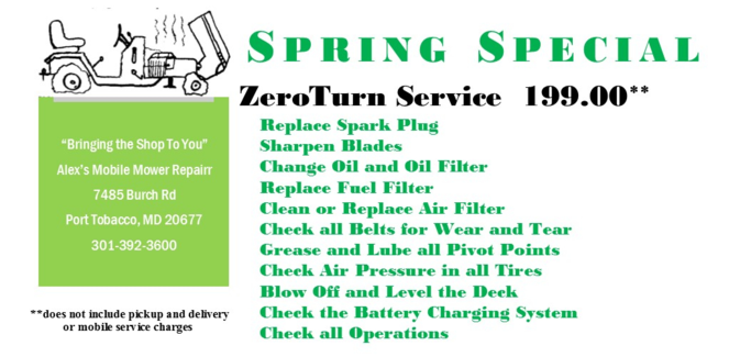 We are a mobile lawn mower and small engine repair service that will come to your house and service and do most repairs there on the spot.